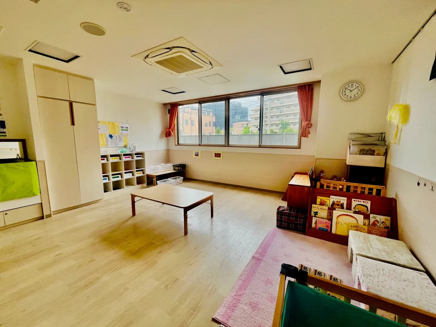 小さな赤ちゃんが過ごす0歳児クラス。個々のペースに合わせて、ゆったりと過ごします。調乳室が併設されています。