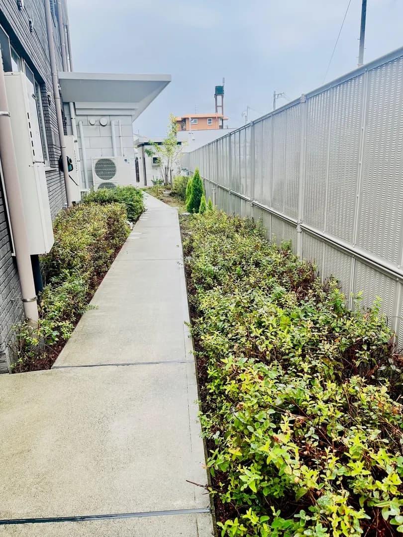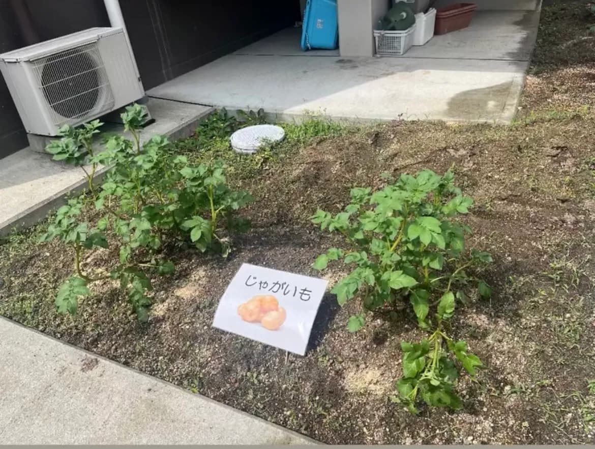 保育園の玄関にある花壇と奥の小さな畑。子どもたちといろんな栽培物を季節ごとに植えています。