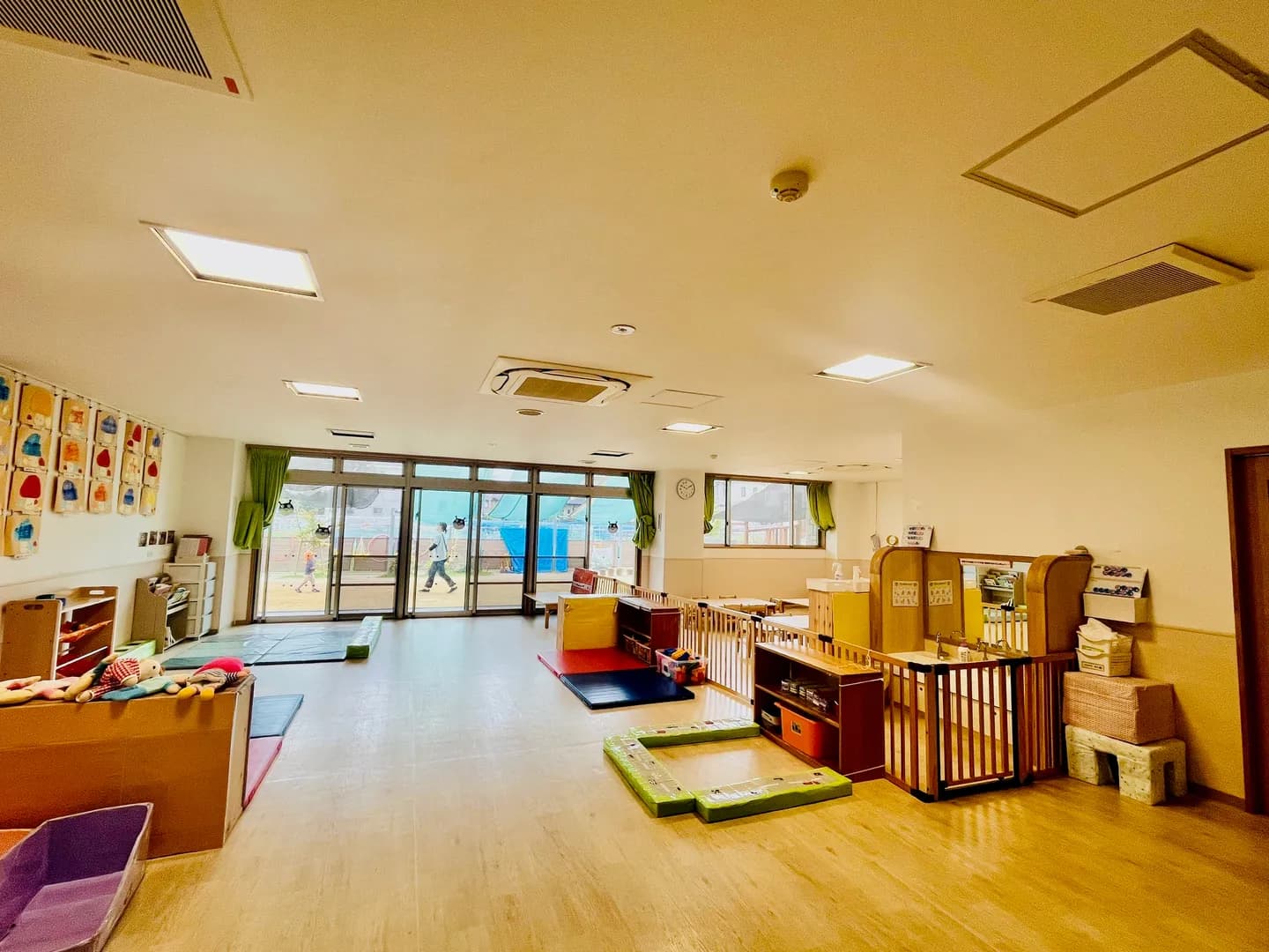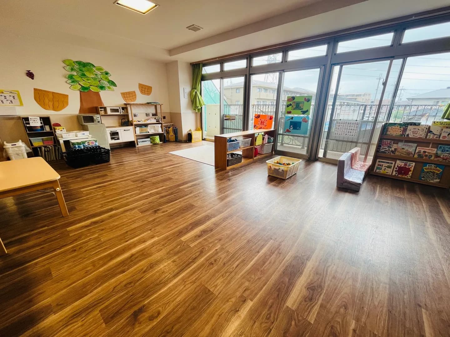 自我が芽生える1歳児クラス。十分に自己発揮できるように広い保育室です。遊び・食事・着替え・排泄がゆったりとしたスペースで行えるようになっています。